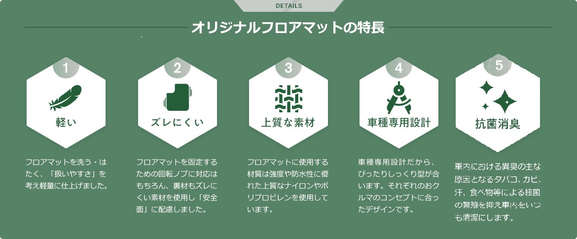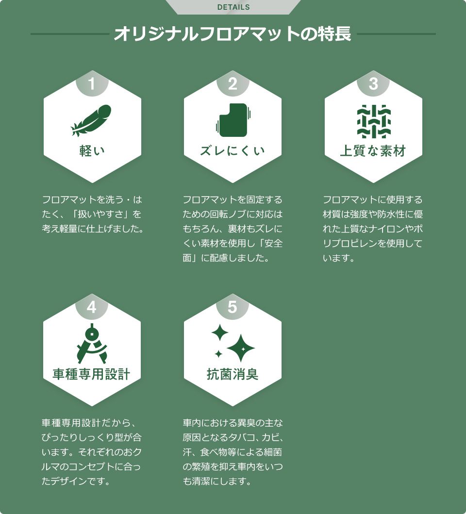 ハニカムグリルデザインのモチーフをマット両サイドに採用、先進性と個性を際立たせます。機能面では消臭・抗菌の機能を持たせ安心してお使いいただける商品となっております。